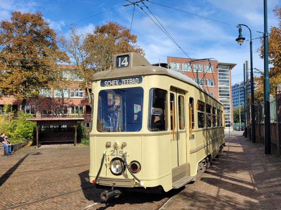 - Historische PCC-tram in karakteristiek Haags uiterlijk uit de jaren ‘60: crème-geel met groene bies