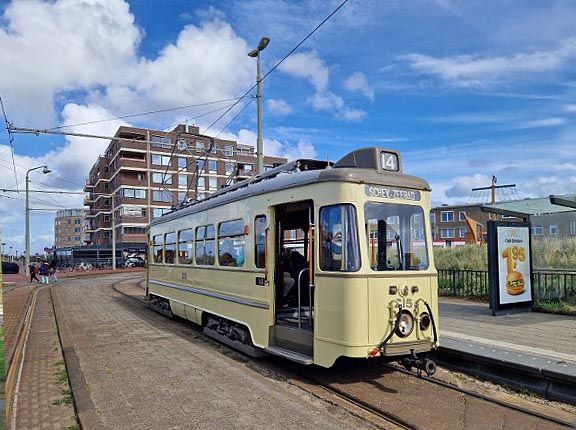 - Historische tram van de voormalige NZH (Noord Zuid-Hollandse Tramweg Maatschappij), die van 1924 tot 1961 reed met elektrische trams onder andere tussen Leiden, Den Haag en Scheveningen. In de karakteristieke donkerblauw/lichtgrijze kleurstelling.